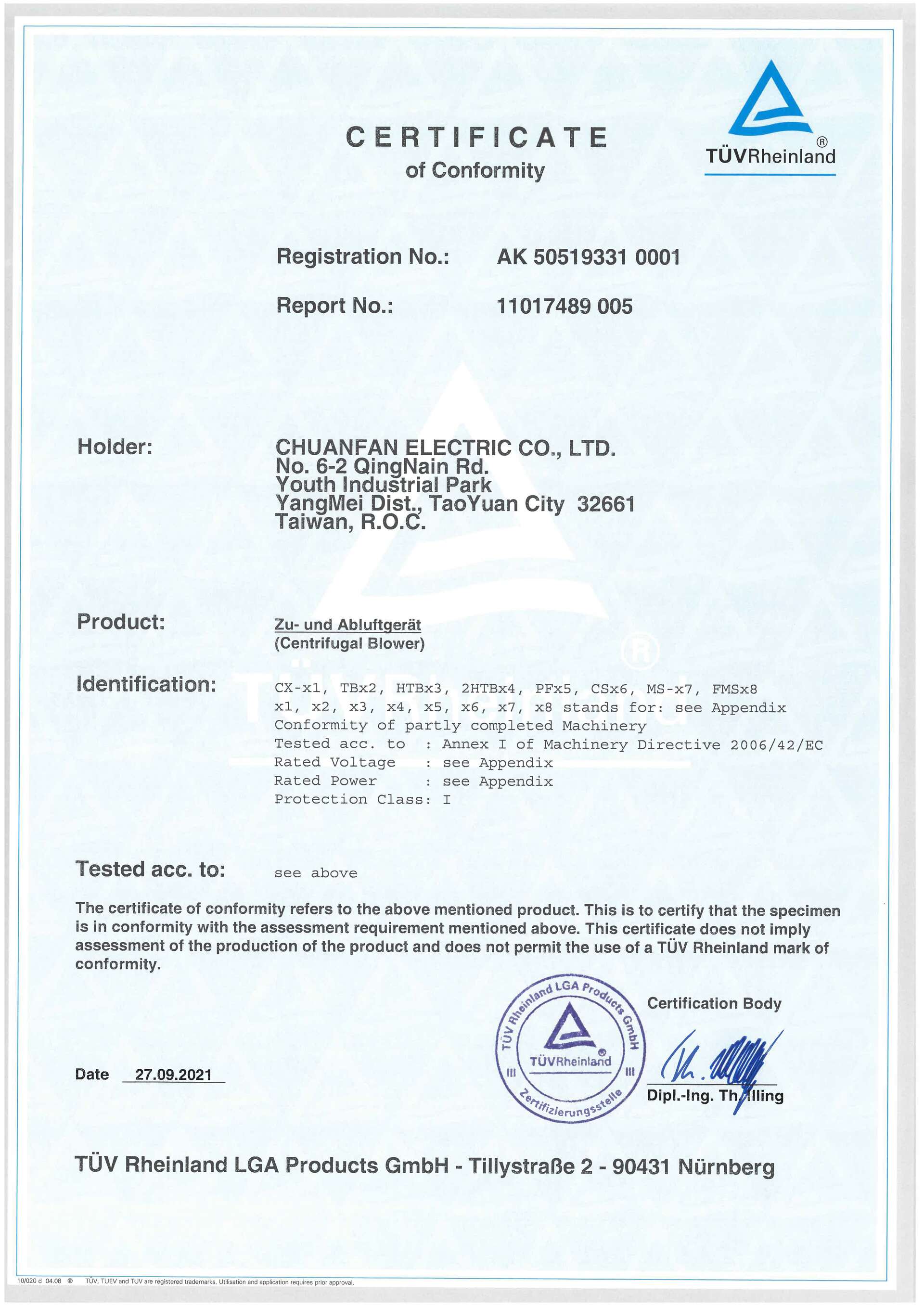 CE Mark 遠心式ブロワー Machinery Directive 2006/42/EC Issuer: TUV Issue Date: 2021/09