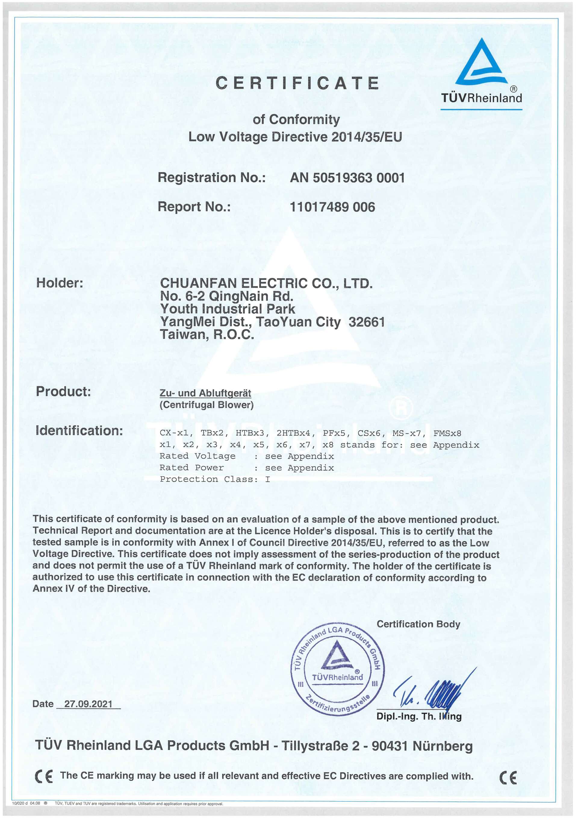 CE Mark 離心式鼓風機 低電壓指令2014/35/EU ∙ 頒發單位: TUV ∙ 頒授日期: 2021/09